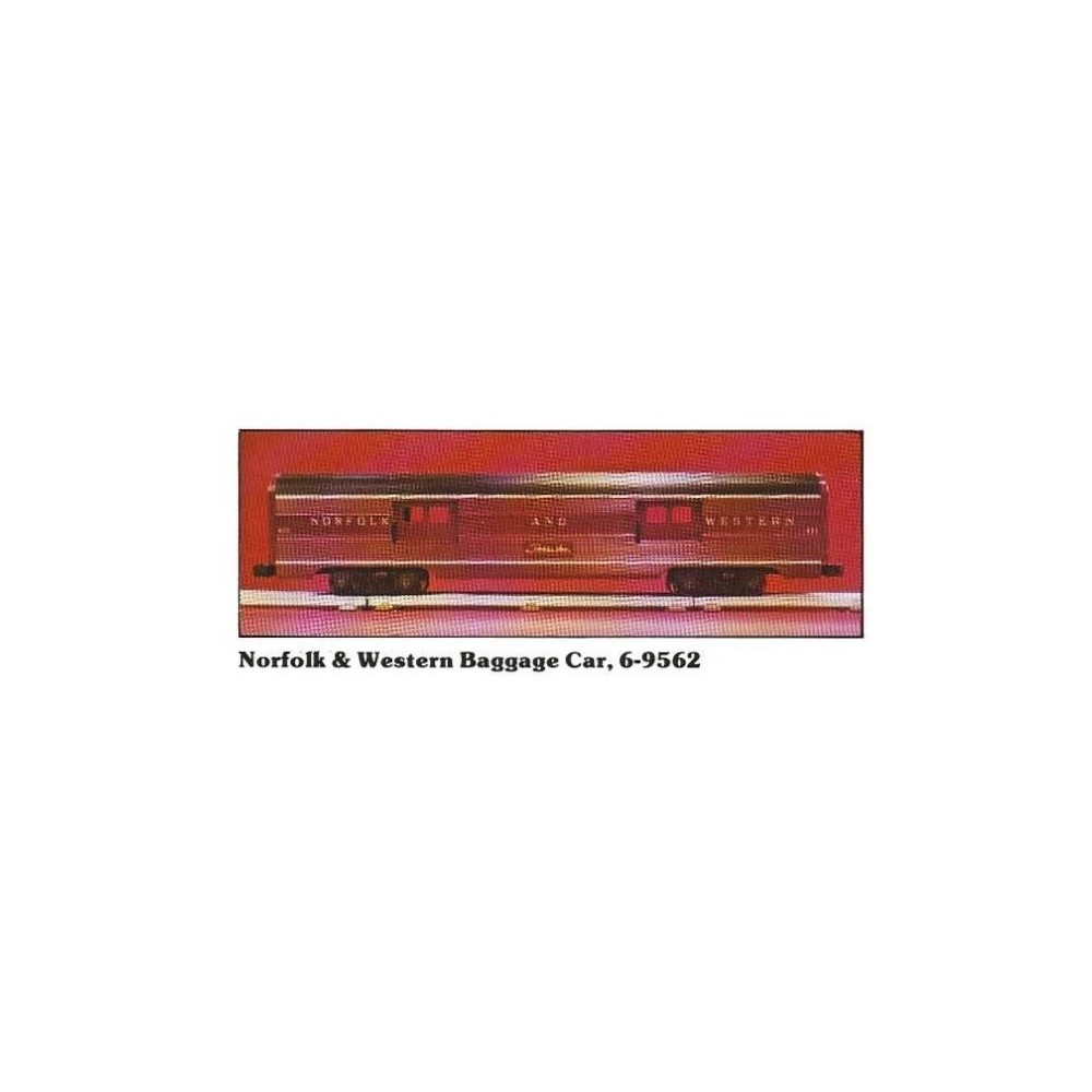This LIONEL 9562 NORFOLK AND WESTERN BAGGAGE CAR features: Highly detailed inside and out, Metallic name plate, Die cast trucks and metal wheels, Metal chassis and Operating knuckle couplers front and rear.