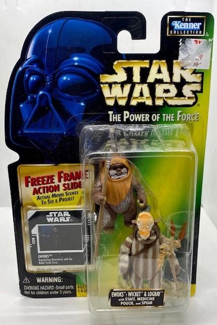 KENNER STAR WARS THE POWER OF THE FORCE EWOKS WICKET AND LOGRAY ACTION FIGURES WITH FREEZE FRAME ACTION SLIDE